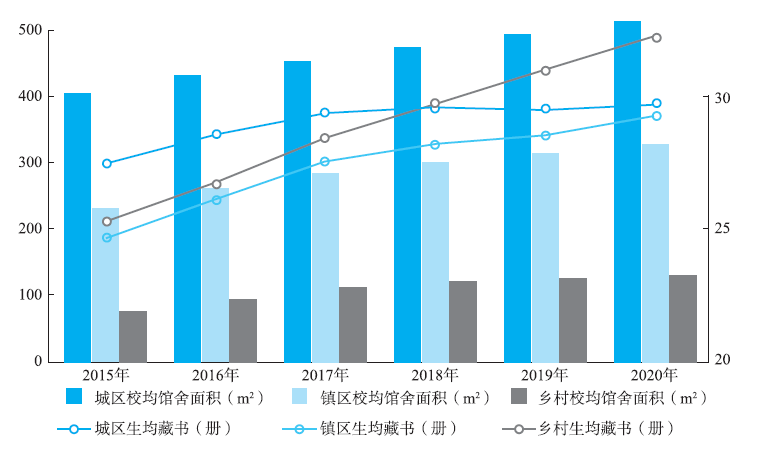 (1)落实经费投入,提高中小学图书馆保障水平。“十三五”期间,一系列基础教育重大建设工程解决了均衡配置图书的问题。“十三五”期末,全国中小学图书馆平均馆舍面积279.37平方米,中小学图书馆生均藏书29.89册,其中小学24.05册,初中36.97册,高中41.07册,达到新《规程》要求的基本藏书量。“十三五”期间,乡村学校人均藏书的短板迅速补齐。2020年末,乡村小学和初中生均藏书量已超过城镇小学和初中(见图1)。各地教育行政部门通过单独设立图书经费、明确图书经费在装备经费中的比例等各种举措,保障了图书装备经费。以小学每册图书10元、中学每册图书15元的采购价格推算,在“十三五”期间,全国中小学图书馆纸质图书采购总投入达到314.82亿元。