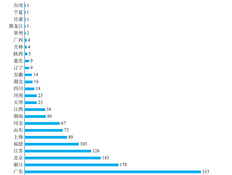 本届展示会共有参展企业1 311家,分布于全国25个省份①(图1)。统计显示,其中有5个省市的参展企业数超过100家,具体为广东省333家、浙江省178家、北京市143家、江苏省126家和福建省103家,合计883家,占参展企业总数的67.3%。山西、内蒙古、海南、云南、西藏、青海、新疆、香港和澳门没有企业参展。这在一定程度上说明,参展企业数量与区域经济社会发展和教育装备行业发展水平呈正相关。