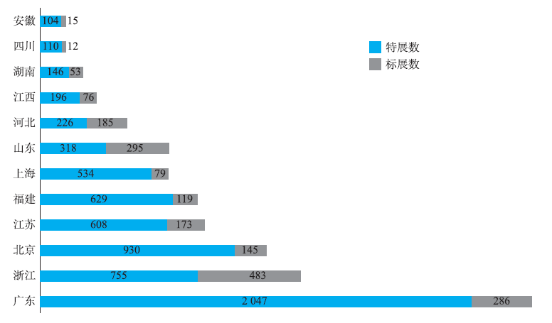 有12个省(市)的特装展位数量累计超过100个(图2),其中广东省高达2 047个,占特装展位数总数的29.9%,浙江的755个和北京的930个分别占特装展位数的a 省份:即我国的省级行政区。全国共有34个省级行政区,包括23个省、5个自治区、4个直辖市、2个特别行政区。11.0%和13.6%。四川省、广东省、安徽省、上海市、山东省、河北省、浙江省等省(市)特装展位数均超过本省展位总数的50%。