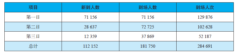 按照新冠肺炎疫情防护要求,本届展示会观众须持有效身份证件进行实名登记。对收集到的观众信息进行统计,本届展示会3天入展馆参观的观众总人数为112 152人、到场参观284 691人次,平均每位观众进馆2.54次,超过历届最高参观人数。从日参观量看,第一天和第二天到场人数均超过7万人,参观人次均突破10万人次;每天都有新到观众入场(表1)。值得关注的是,本届展示会最后一天仍有新到观众12 359人,参观超过5万人次。