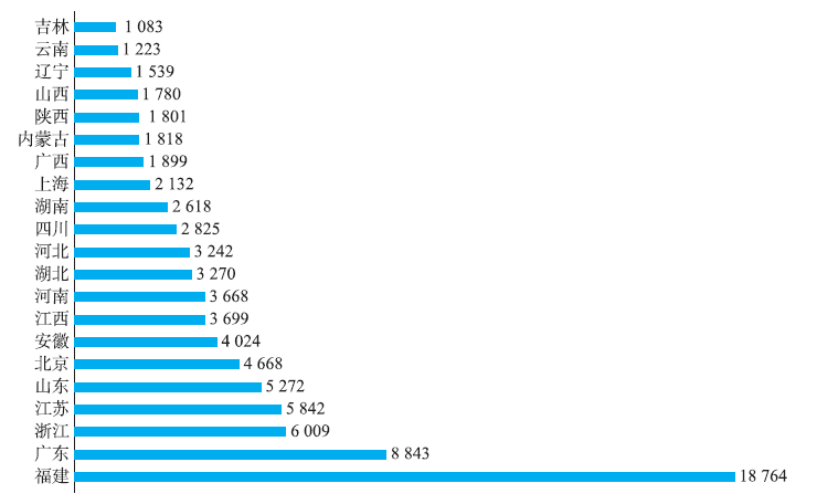 有来自全国31个省(区、市)的观众参观,21个省(区、市)的观众超过千人(图3)。其中来自福建省的观众最多,达18 764人,占比20.63%;其次是广东和浙江,分别为8 843人和6 009人,占比9.72%和6.61%。