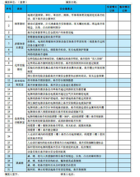 表1 中小学教育装备安全隐患重点排查情况记录表
