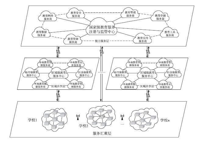 区域共享层基于国家级教育服务注册与监管中心和企业级云基础服务,聚合区域内的教育数据、教育资源,以及共建共享网络学习空间、教育管理系统、教学教研系统等基础性教育业务平台,提供SaaS应用,支撑区域学校集体备课、网络研修、学科教学和科学管理决策,促进区域教师、学生、管理者和家长等信息化应用主体协同发展。